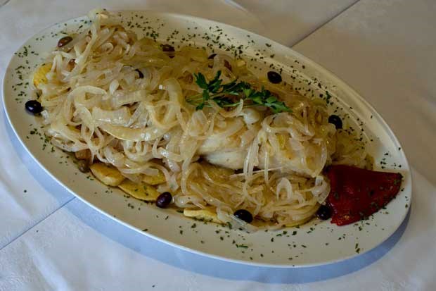 Detenhamo-nos, então, sobre o Bacalhau à Julinha, cuja meia dose (18 euros) é de molde a dar que fazer a dois ou três pretendentes. A meia posta, da altura de uma mão e servida em travessa, chega à mesa numa cama de batatinha frita às rodelas e escondida por ampla cobertura de cebola translúcida.
