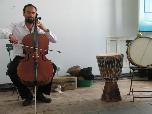 Alentejo, Évora, músico Hugo Fernandes ensaia na Sociedade Harmonia Eborense.