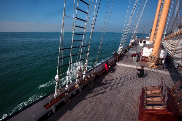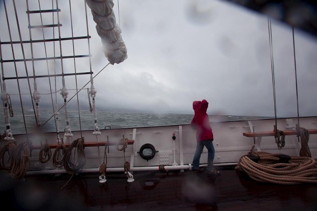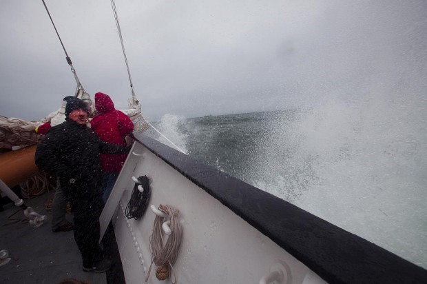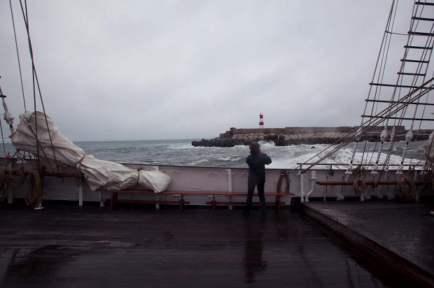 O farol de Aveiro ainda mal tinha ficado para trás e já a proa do antigo lugre bacalhoeiro estava a rasgar as vagas, num verdadeiro movimento de sobe e desce, com a água a entrar para o convés. Para os cerca de 50 passageiros que seguem a bordo - que no SMM são chamados de "participantes activos", uma vez que todos são convidados (mas não obrigados) a participar nas tarefas de bordo -, é altura de obrigar o corpo a habituar-se aos embalos e a procurar um local onde o balanço se faça sentir com menor impacto.