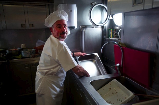 Está na altura da primeira refeição a bordo, já em alto-mar - para muitos, este será o momento do verdadeiro teste ao organismo em matéria de enjoos. Ao almoço serão servidos uns deliciosos rojões, confeccionados em plena navegação por Donaciano Miranda, cozinheiro do navio, e Fernando Vilarinho, o seu ajudante. Ambos têm uma longa experiência de cozinha em viagens de navios de pesca e garantem que esta é das funções mais exigentes a bordo. "Aqui não se pode enjoar. É preciso preparar as refeições para as pessoas haja a ondulação que houver", relata Donaciano.