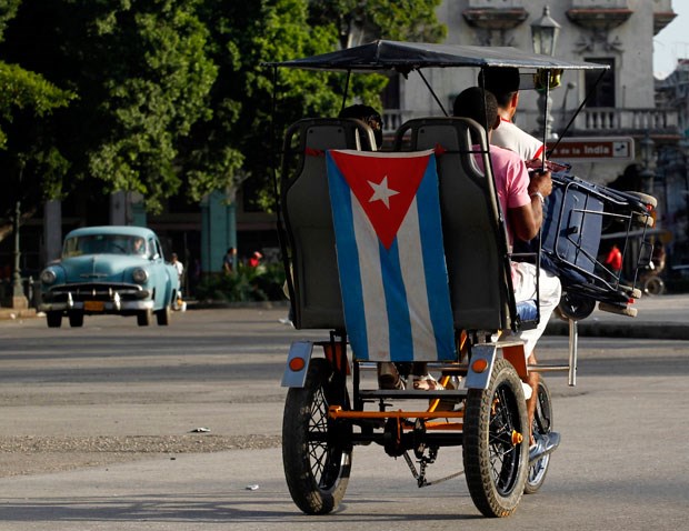 Táxi a pedal engalanado com bandeira cubana