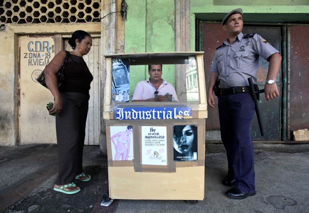 Relojoeiro nas ruas de Havana com barraca bem decorada. No poster central, entre modelos, lê-se: ´Hoy es un día maravilloso. Usted verá como ahorita viene alguién y lo jode´