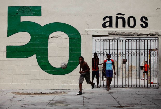 Jogo de bola entre jovens cubanos. Na parede, um mural alusivo aos 50 anos da revolução (Junho 2011)