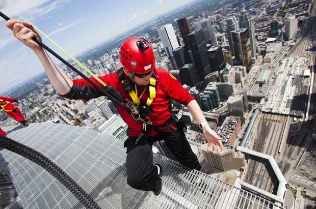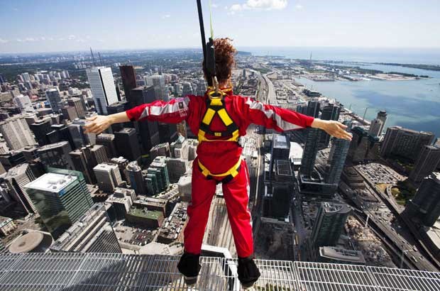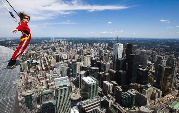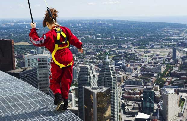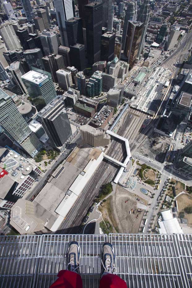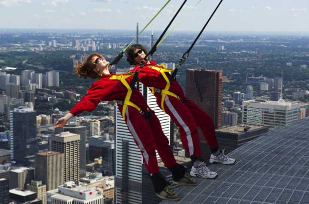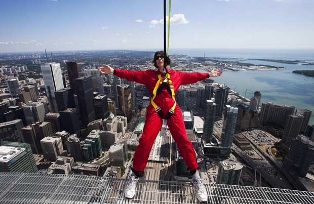 A CN Tower de Toronto estreou uma atracção extrema: a Edge Walk, caminhada no topo da torre, a 356m do chão. Os participantes estão presos por arneses e ligados a um sistema de carril que lhes permite andar e oscilar "à beira do abismo". Aqui, um grupo de jornalistas foi experimentar esta vertiginosa caminhada...