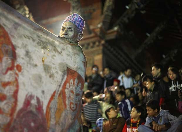 Em preparação para uma dança religiosa, a Narsingh Avatar, no último dia do festival tradicional de dança Kartic, em Lalitpur. Novembro, 2011.