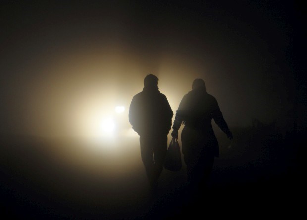 Um casal caminha por uma rua numa manhã de nevoeiro em Taudaha, em Katmandu. Novembro, 2011.