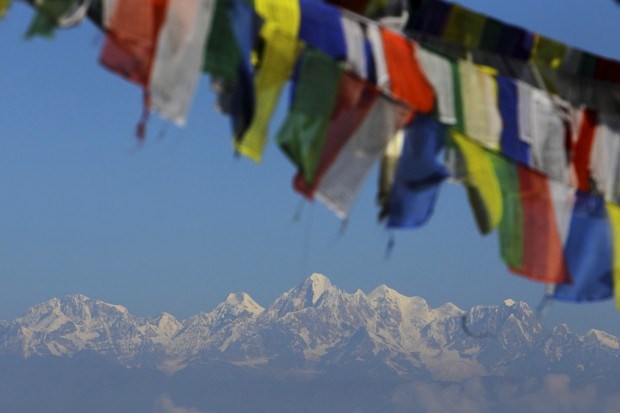 Evereste ao fundo com bandeiras religiosas a ondular ao vento. Vista a partir do mosteiro Thrangu Tashi Yangtse, Kavre, perto de Katmandu.
