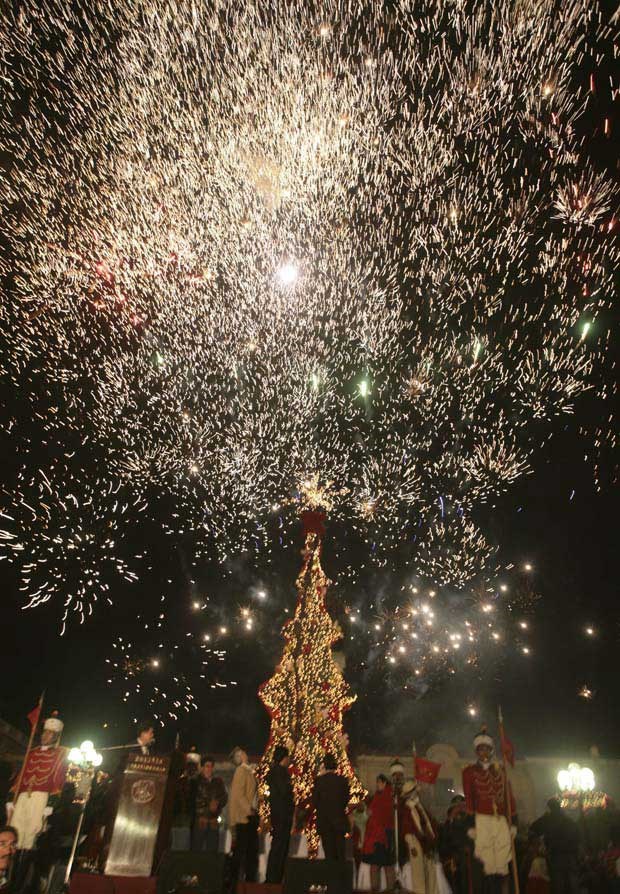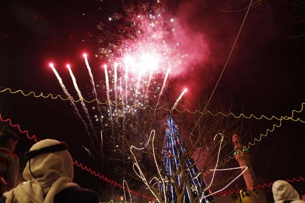 Cisjordânia, Belém. Palestinianos observam os fogos de artifício durante a cerimónia de iluminação da árvore de Natal no largo da Igreja da Natividade, o local venerado como o do nascimento de Jesus Cristo Mohamad Torokman/Reuters