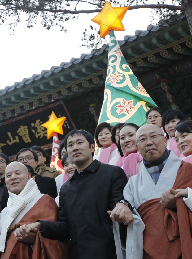 Coreia do Sul. O líder dos budistas sul-coreanos, um padre católico e crentes de ambas as fés dão as mãos durante um evento de inauguração das árvores de Natal colocadas no templo budista de Jogye. O objectivo é enaltecer a paz e concórdia entre as diferentes religiões. Lee Jae-Wo/Reuters