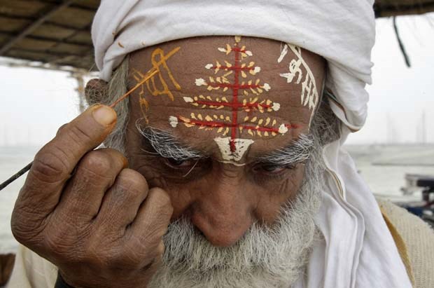 Índia. Um hindu escreve “Feliz Natal” em hindi na testa, nas margens do rio Ganges, em Allahabad. Jitendra Prakash/Reuters