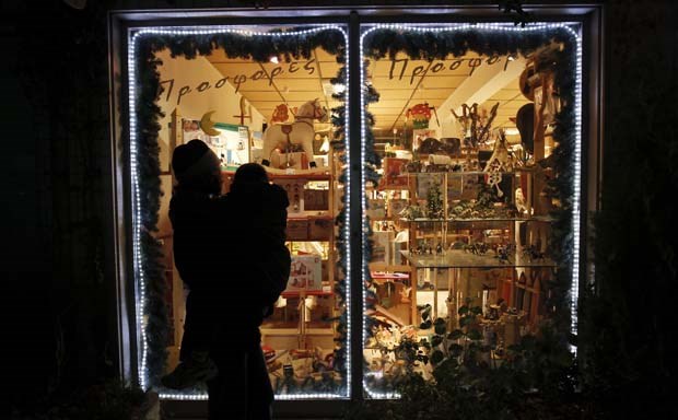 Grécia. Uma mãe com o filho ao colo espreitam a montra de uma loja de brinquedos em Atenas. Yiorgos Karahalis/Reuters