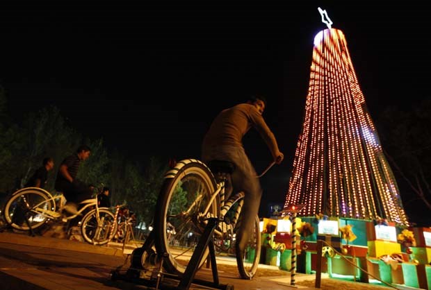 México. Árvore de Natal decorada com cerca de 8 mil luzes. A energia é conseguida pedalando em 15 bicicletas. Todos os visitantes são chamados a colaborar. Imelda Medina/Reuters