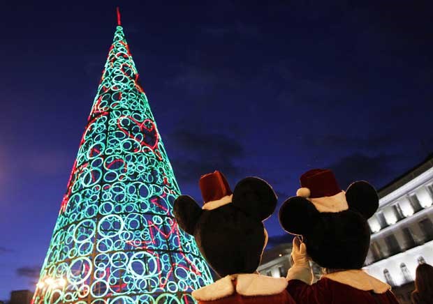 Espanha. Mickey e Minie admiram a árvore de Natal feita de luzes na Puerta del Sol, Madrid. Susana Vera/Reuters