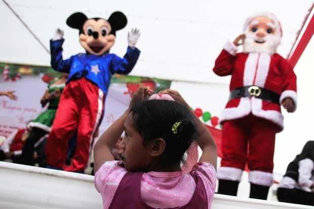 Peru. Mickey e o Pai Natal fazem as delícias desta pequena espectadora. Em Lima Pilar Olivares/Reuters