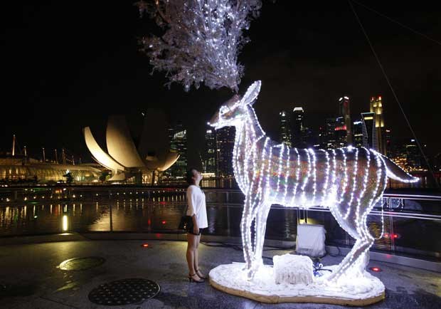 Singapura. Olhos nos olhos com um rena natalícia, com o centro financeiro de Singapura nos bastidores Joel Boh/Reuters