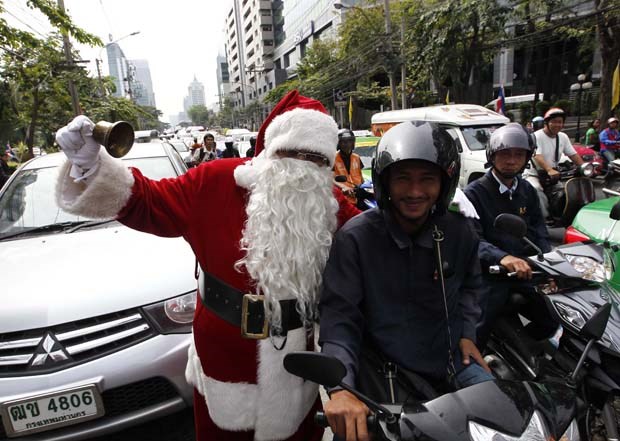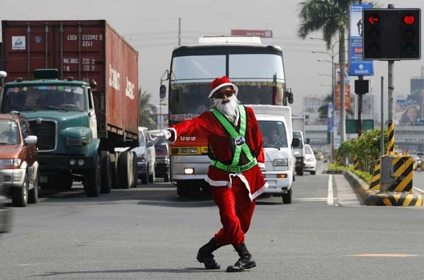 Filipinas. O controlador de tráfego Ramiro Hinojas, em Pasay, decidiu vestir-se de Pai Natal. Aqui, é visto reflectido no espelho lateral de um veículo Cheryl Ravelo/Reuters