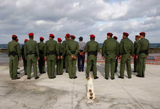 Soldados e um fiel companheiro na avenida El Malecón Claudia Daut/Reuters