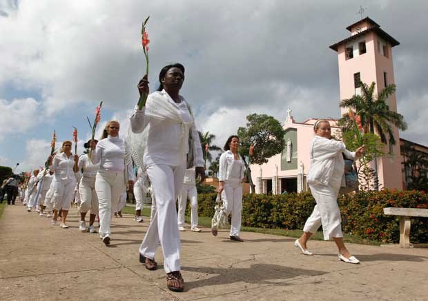 As "Senhoras de Branco", mães e familiares de dissidentes, durante um dos seus silenciosos protestos semanais: vestem de branco ao domingo, vão à missa e caminham pelas ruas Enrique de la Osa/Reuters