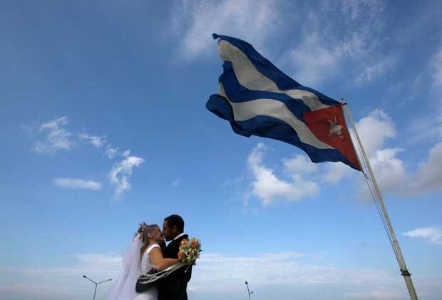 Um noivo cubano beija a sua noiva canadiana sob a bandeira de Cuba, em Havana Claudia Daut/Reuters