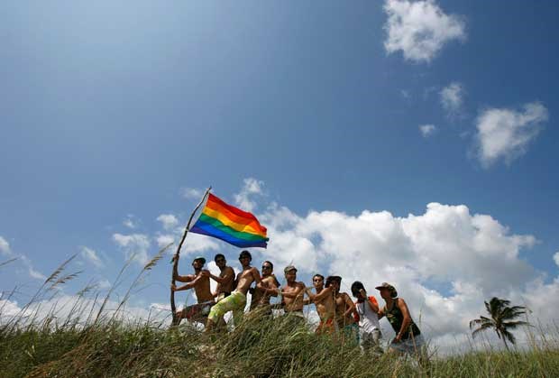 Sinais da abertura: um grupo de homens com a bandeira arco-íris da comunidade gay durante a abertura de um encontro de Verão numa praia perto de Havana Claudia Daut/Reuters