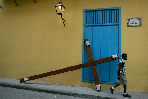 Um homem passa perto de uma cruz durante a Via Crucis, procissão da sexta-feira santa Enrique de la Osa/Reuters