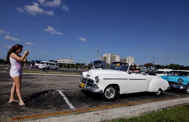 Uma turista fotografa um carro vintage americana na Praça da Revolução Enrique de la Osa/Reuters