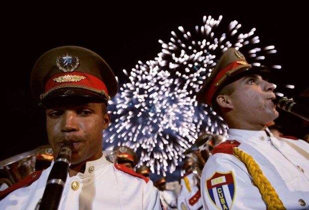 Membros de uma banda militar acompanham a pirotecnia da festa que celebrou um aniversário da entrada de Castro em Havana, em 1959 Enrique de la Osa/Reuters