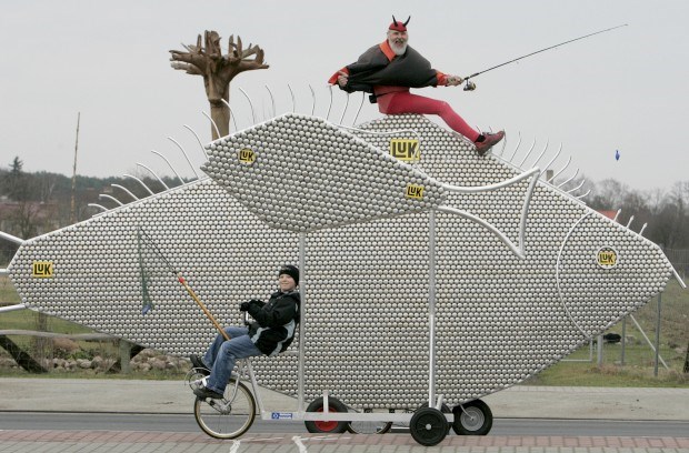 Obra do designer alemão de bicicletas Didi Senft, conhecido como El Diablo. É a bicicleta Klingelfisch (peixe sino), feita de mais de 10 mil chapas de campaínhas. Tobias Schwarz/Reuters