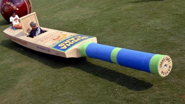 Na Índia. Sudhakar Yadav guia um carro em forma de bastão de criquete, criado para apoiar a selecção indiana no mundial da modalidade. Krishnendu Halder/Reuters