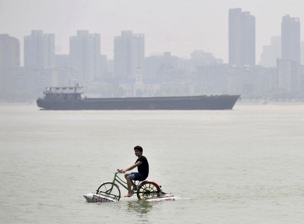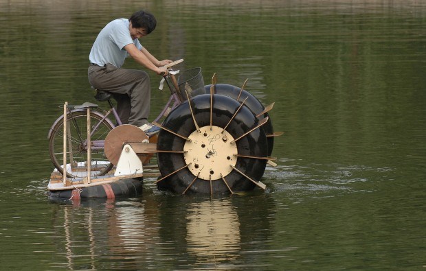 Na China. Li Zhiyuan conduz um "barco" a pedal feito de bicicletas, madeira, pneus e materiais reciclados. Custou-lhe um mês de trabalho e cerca de 20 euros. Jianan Yu/Reuters