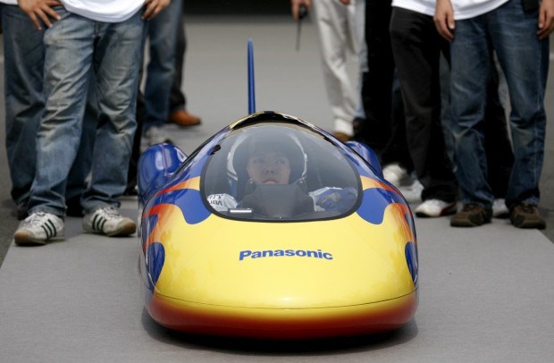 Takashi Sudo, um estudante de Osaca, Japão, num veículo alimentado a pilhas da Panasonic. Entrou para o Guinness como o carro mais rápido alimentado a pilhas. O percurso de 1km foi completado a 105.95 km/h Kiyoshi Ota/Reuters