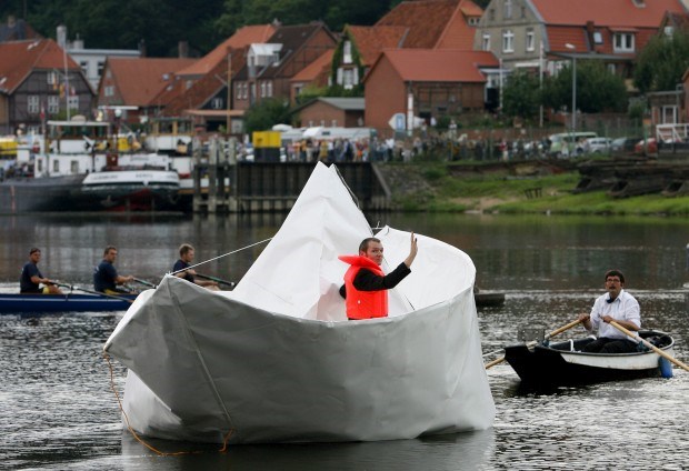 Um barco de papel em tamanho real feito pelo artista Frank Boelter. Na Alemanha Christian Charisius/Reuters
