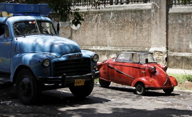 Ao lado do camião, está um carro praticamente "normal", retratado em Cuba. É um microcarro, o Messerschmitt KR200 de 1957, baptizado de Kabinenroller e inventado por Fritz Fend na Alemanha. Foi produzido entre 1955 e 1964. Um carro-bolha de três rodas que pode atingir 100km/h. Actualmente, existirão apenas 36 unidades em Cuba, 16 nos EUA e uma centena na Alemanha. Desmond Boylan/Reuters