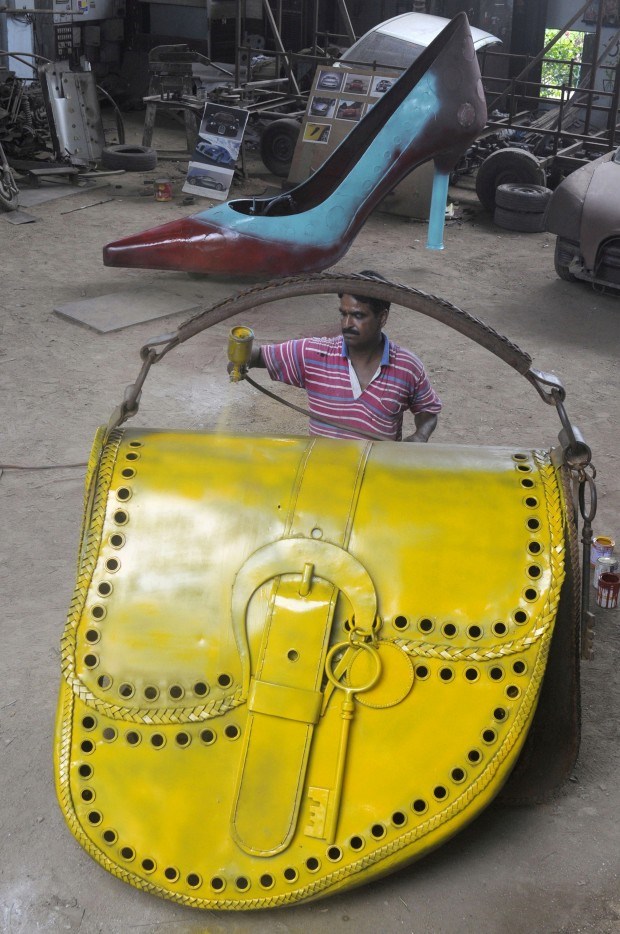 A preparar um carro-mala de senhora... Na Índia. O veículo tem três rodas e foi criado pelo designer indiano de automóveis Sudhakar Yadav. Faz parte de uma série de veículos que criou inspirados em itens femininos... Krishnendu Halder/Reuters