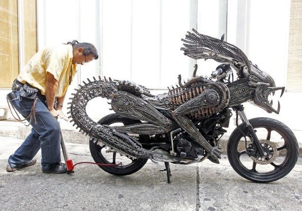 Na Tailândia. O artista Roongrojna Sangwongprisarn criou uma motocicleta de formas alienígenas a partir de materiais reciclados e partes de carros e bicicletas Sukree Sukplang/Reuters