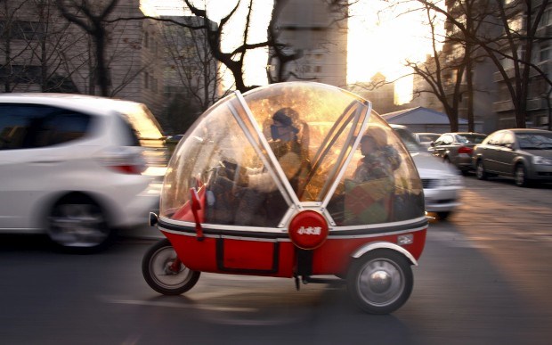 Um normalíssimo carro-cápsula eléctrico na China, conduzido aqui por uma mulher, com o filho ao lado, por Pequim. David Gray/Reuters
