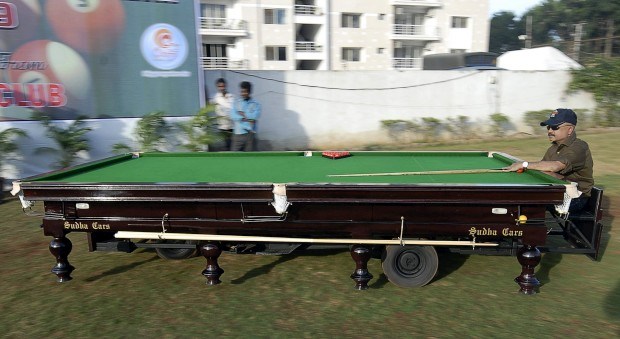 O designer indiano de automóveis Sudhakar Yadav guia o seu carro em forma de mesa de snooker. Com três rodas, atinge 45kkm/h. É melhor não jogar enquanto conduz... Na Índia. Krishnendu Halder/Reuters