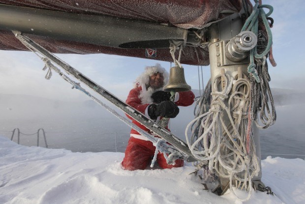 A -10ºC, o "Pai Natal" Valery Kokoulin toca o sino do seu iate em Krasnoyarsk, Sibéria, Rússia Ilya Naymushin / Reuters