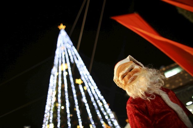 Um rapaz mascarado de Pai Natal junto à árvore da cidade de Nazaré, Israel Ammar Awad/Reuters