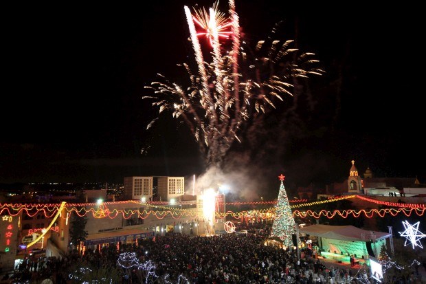 Celebrações palestinianas na iluminação da árvore de Natal perto da Igreja da Natividade, Belém, Cisjordânia Musa Al Shaer/AFP