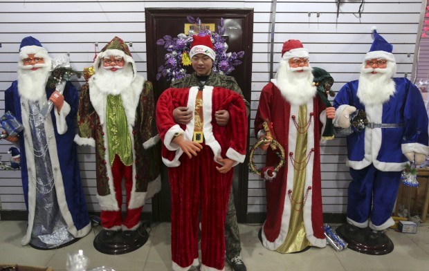 Na China, um vendedor arranja fatos do Pai Natal num mercado de Wuhan Reuters
