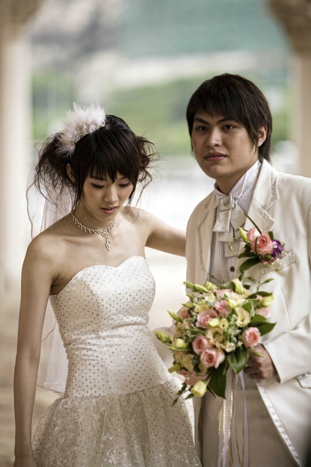 Casal de noivos durante a sua sessão fotográfica, em Tóquio