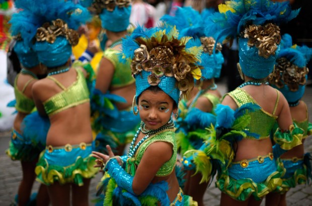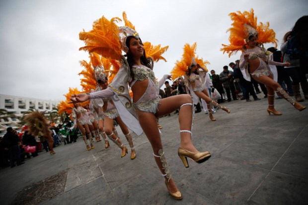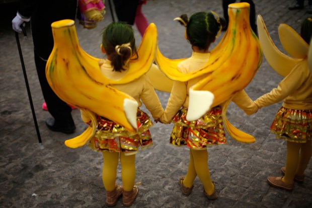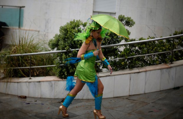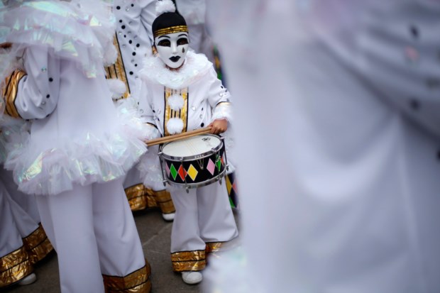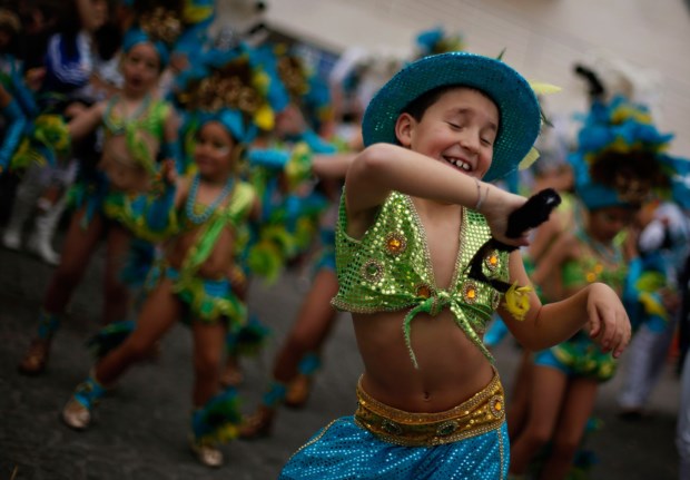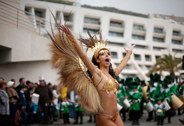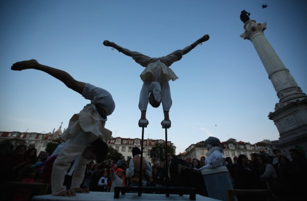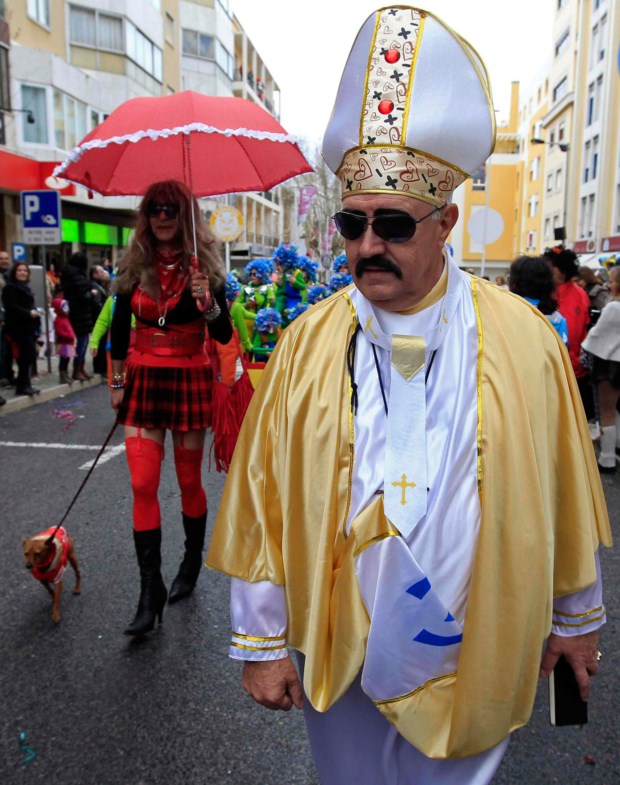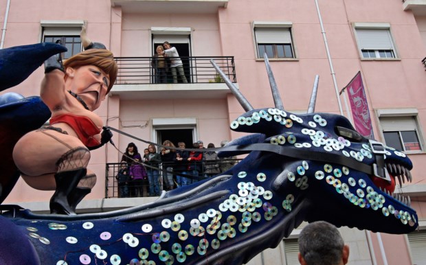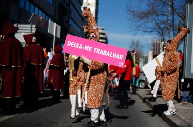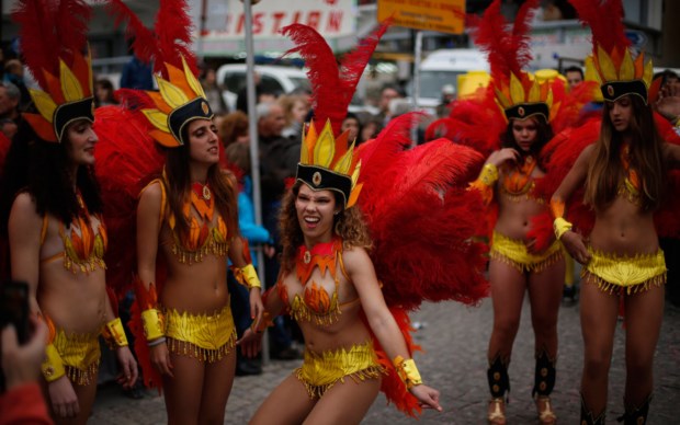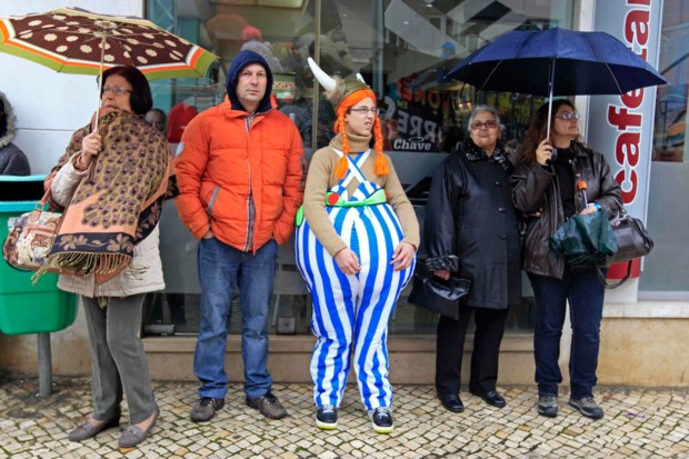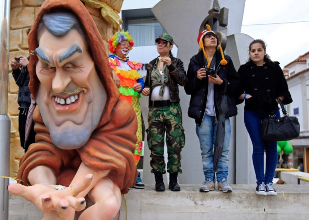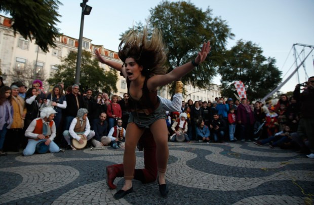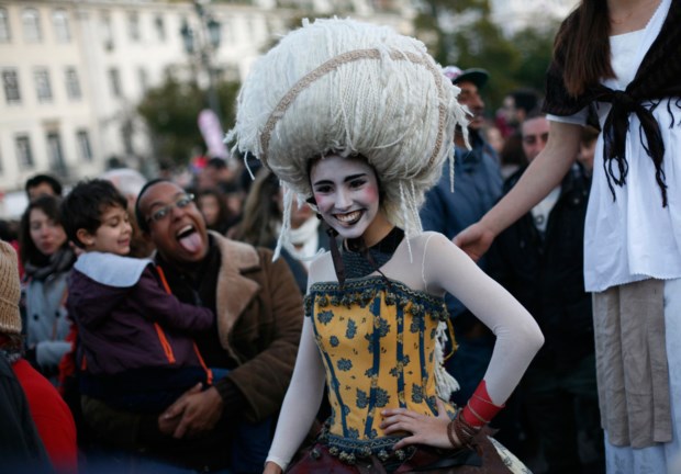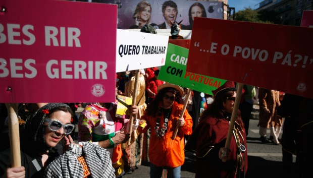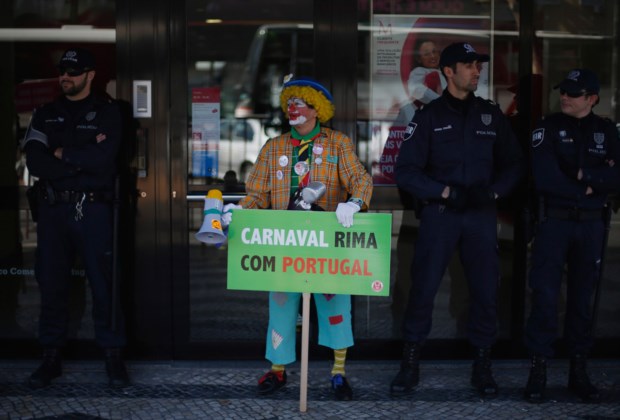 Foliões à solta no Carnaval de Sesimbra, Torres Vedras e Lisboa. Em frente à sede do FMI, em Lisboa, houve muitos cartazes. Um deles anunciava: "Carnaval rima com Portugal".