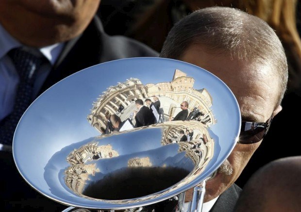 A Basílica de São Pedro reflectida na tuba de um músico durante uma das audiências semanais do Papa Tony Gentile/Reuters