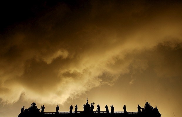 As silhuetas das estátuas no topo da Basílica sob nuvens de tempestade Max Rossi/Reuters