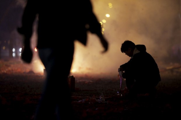 Fogo de artifício iluminando edifícios da cidade fronteiriça chinesa de Dandong, em frente à cidade norte-coreana de Sinuiju AFP PHOTO / JOHANNES EISELE