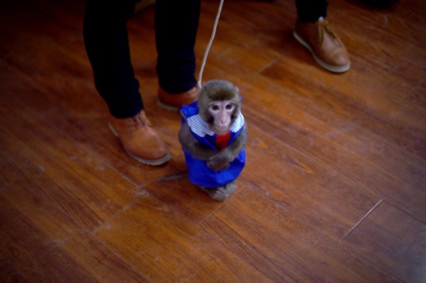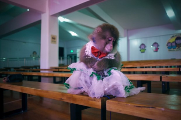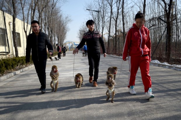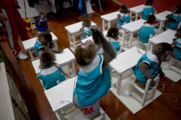 Macaco durante o ensaio numa escola de treino no jardim zoológico em Dongying, província de Shandong, China AFP PHOTO / WANG ZHAO