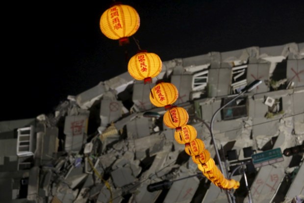 Lanternas junto ao prédio que desabou após um terramoto, no primeiro dia do Ano Novo Lunar chinês em Tainan, sul de Taiwan REUTERS / Tyrone Siu