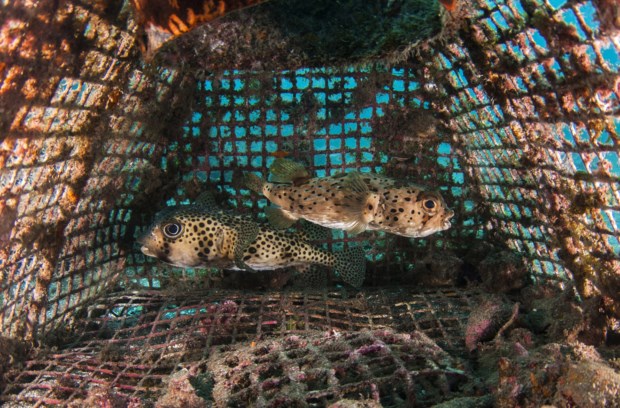 Peixes-balão encurralados numa armadilha abandonada. A pesca fantasma (utensílios de pesca abandonados ou perdidos no mar) mata milhares de animais marinhos anualmente. 1º Lugar em Peixes e Invertebrados Nuno Vasco Rodrigues