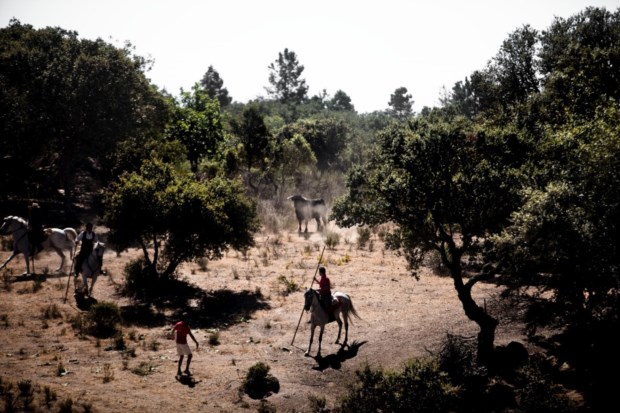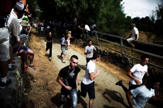 Já sobre os restantes, as informações contradizem-se: uns dizem que agora só se conseguem apanhar no alto, outros que o melhor é tentar travá-los antes que passem a estrada. Junto ao asfalto, carrinhas, motos, jipes posicionam-se estrategicamente no topo dos maciços de rocha. Alguns aproveitam o momento de pausa para a merenda: dos carros vão saindo pão e queijos, presuntos e chouriças, além de garrafões de vinho. Outros, como um grupo de mulheres, literalmente dos oito aos 80 anos, numa carrinha de matrícula espanhola, permanecem nos poisos mais cimeiros de onde conseguem acompanhar a acção. Mas há ainda quem se prepare para tudo. É o caso de uma mulher que não tira a mão de uma árvore à beira da estrada. De vez em quando há um alarme falso de que os bois vêm aí. E então, além da mão, a mulher coloca o pé a jeito no tronco. “Estás a preparar-te para trepar?”